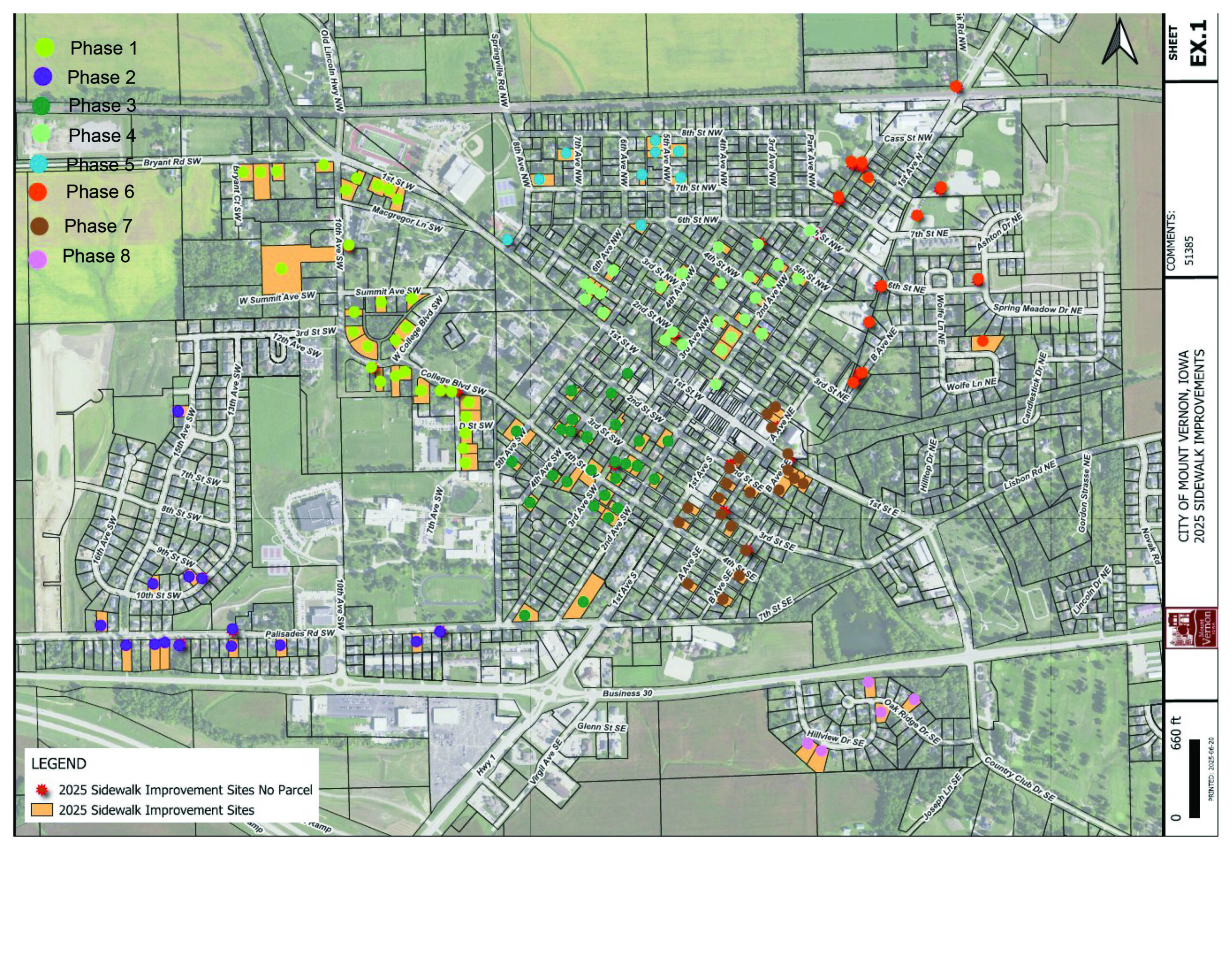The City will provide regular updates on active work locations via the City website and Facebook to notify residents of the areas to be affected 48 hours prior to closure. The City website URL is https://www.cityofmtvernon-ia.gov and Facebook can be accessed HERE. Below is a map of the phases of the project and the areas that will be affected by each phase.