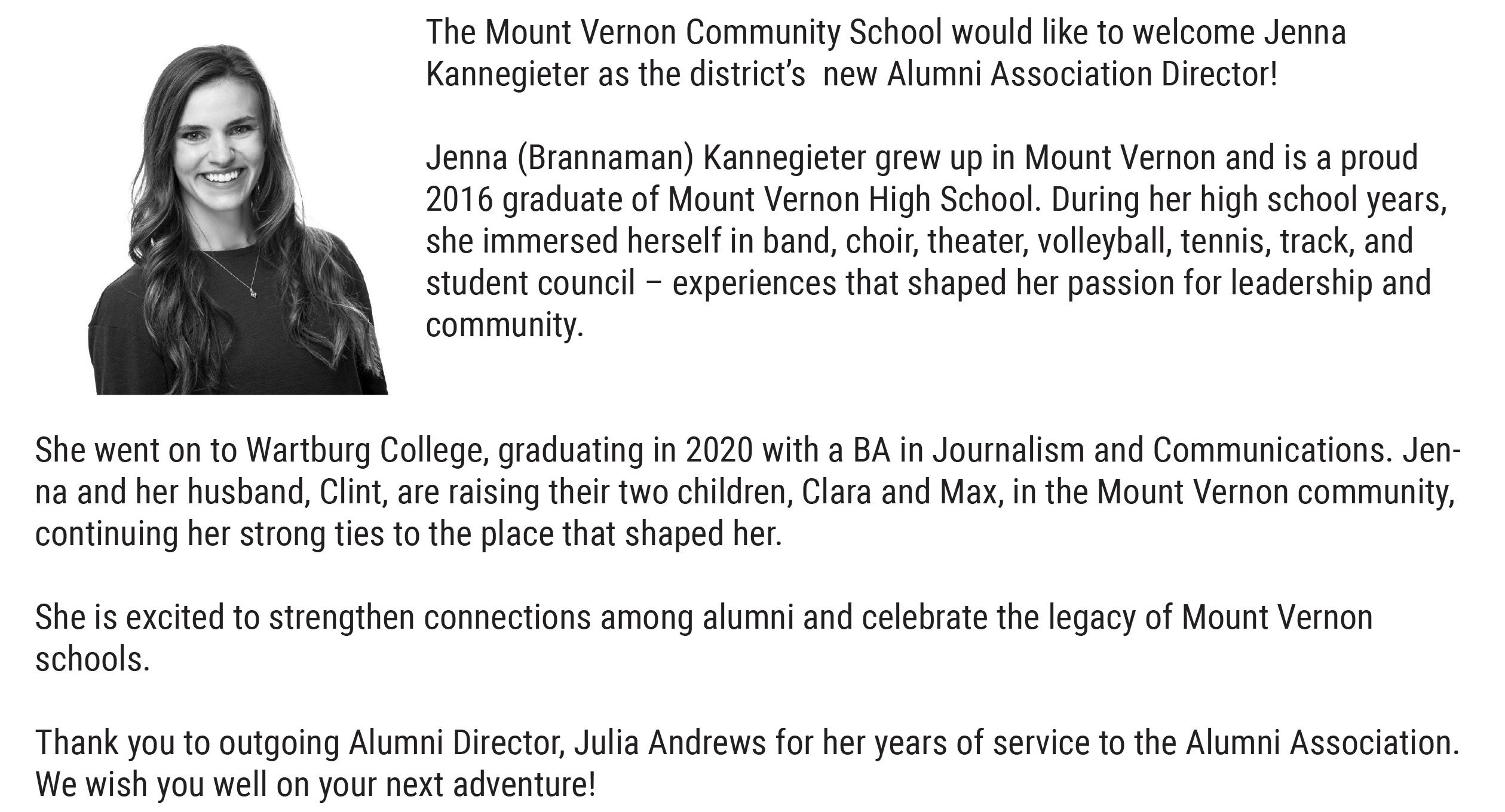New Alumni Director is Announced December 9, 2025 News Related News All News Announcements Jun 15, 2021 School Board News Brief – June 2021 Mount Vernon Community School District School Board News Brief June 2021 The regular monthly meeting of the Mount Vernon Community… Read more Announcements Apr 16, 2021 2021-22 District Calendar Released The Mount Vernon School Board approved the 2021-22 Calendar. The calendar can be found at the following link: 2021-22… Read more News Jan 12, 2022 MVCSD JOB FAIR – February 9, 2022 The Mount Vernon Community School District will be hosting a Job Fair on February 9, 2022. Click on the link… Read more